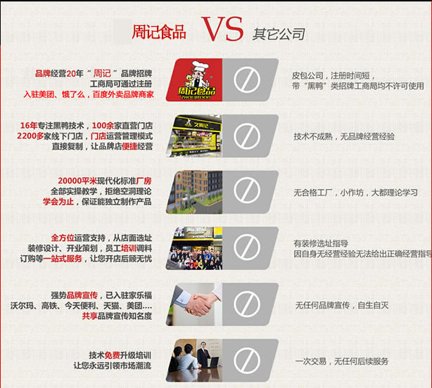 针对很多投资者不方便来武汉公司实地考察,又担心武汉黑鸭的做法和口味问题,久周记在业内率先推出了久周记武汉黑鸭样品免费邮寄。先试吃,再合作;不满意,不合作。最大限度降低加盟商创业风险。当然,随时欢迎大家来武汉周记食品总部实地考察。